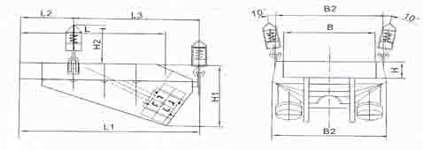 GZG電機振動給料機(電機側置式)電機轉動給料機設計時未考慮倉壓倒影響,為保證給料機的正常運行,必須盡量減少倉壓對給料機的影響。因此在設計溜嘴時,應用溜嘴的后側板承擔料柱的垂直壓力。溜嘴形式及配置尺寸可參考圖及表中數值。