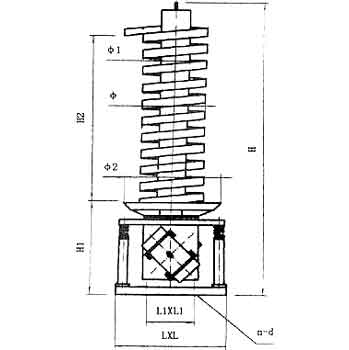 • ZC垂直振動輸送機的驅動裝置振動電機安裝在輸送塔下部,兩臺振動電機對稱交叉安裝,輸送塔由管體和焊接在管體周圍的螺旋輸送槽組成,輸送塔座于減振裝置上,減振裝置由底座和隔振彈簧組成。